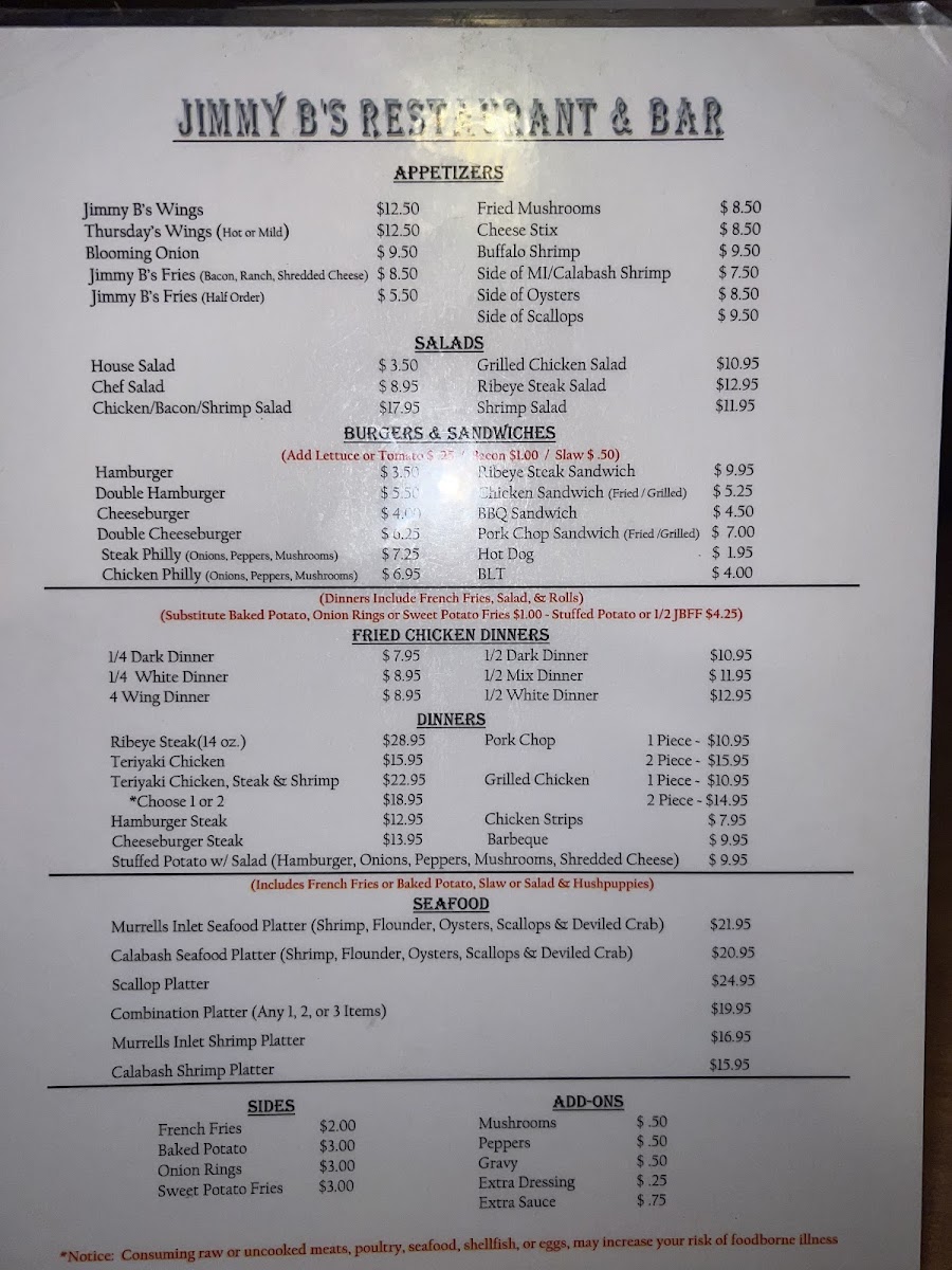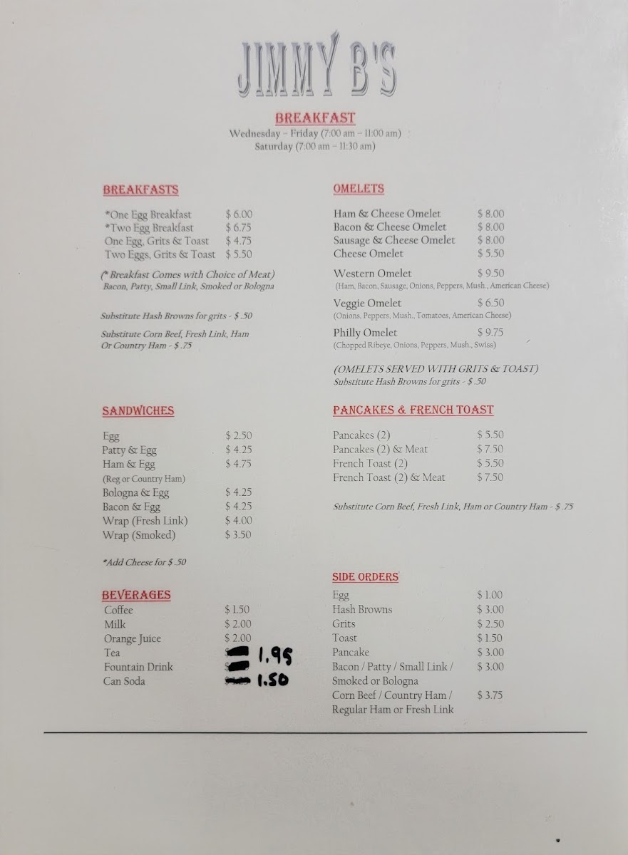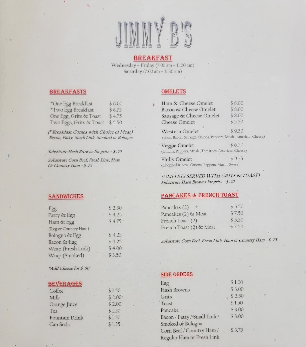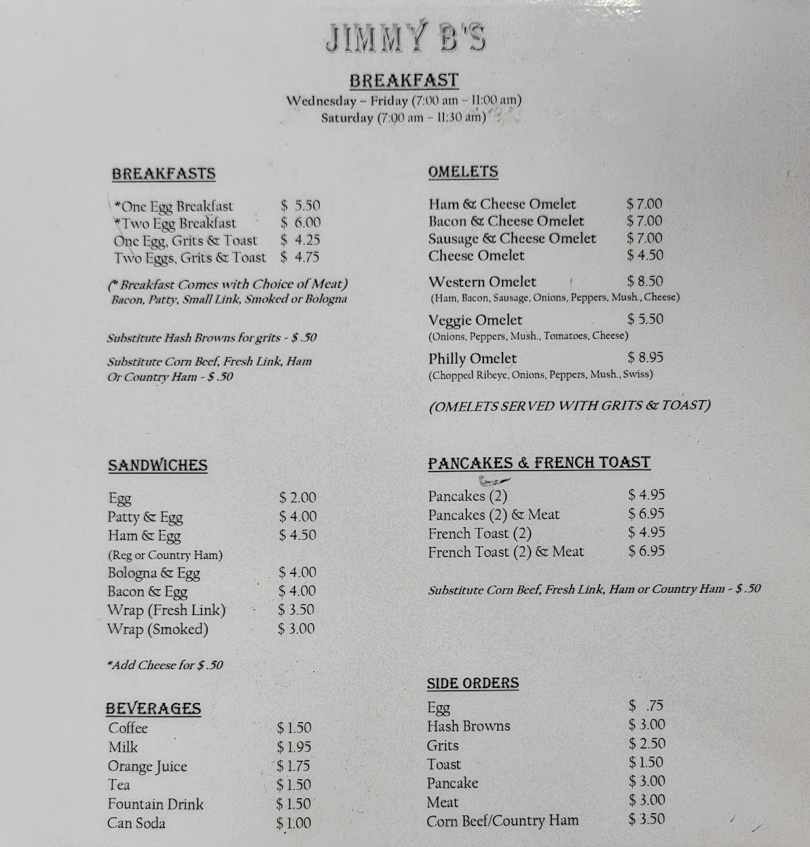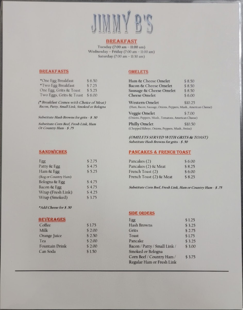 Jimmy B's offers a straightforward American menu that feels like home. The selection combines classic breakfast favorites with hearty dinner options, making it a welcoming spot whether you’re starting your day or settling in for an evening meal. The menu features familiar staples like omelets, pancakes, and French toast for mornings, alongside comforting dinner plates such as fried pork chops and stuffed baked potatoes.